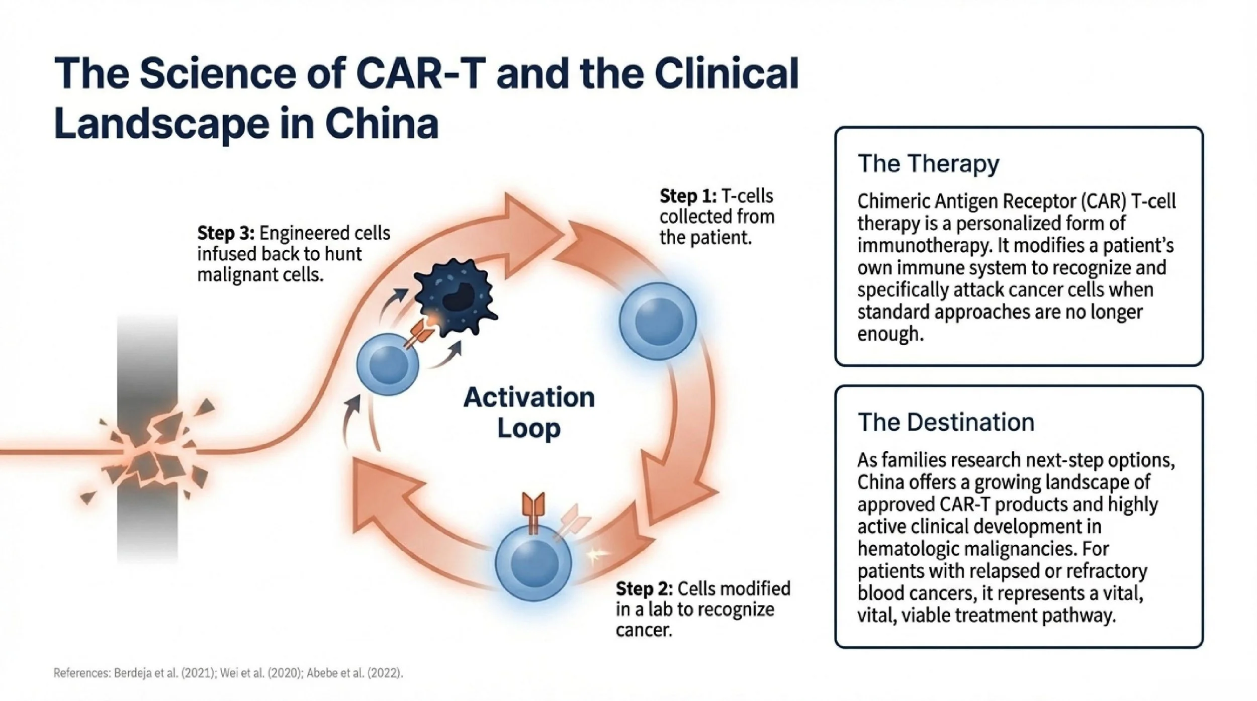 As they researched next-step options, Alex’s family came across China’s growing experience in CAR-T therapy, including approved products and active clinical development in hematologic malignancies. For patients with relapsed or refractory blood cancers, CAR-T therapy has become an important treatment pathway in selected cases, particularly after prior therapies have failed.¹ ² ³