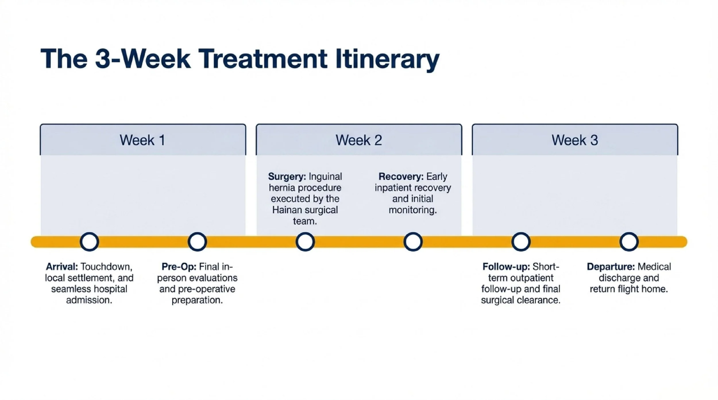 A three-week itinerary was arranged to make the treatment period more manageable, with time allowed for hospital admission, surgery, early recovery, and short-term follow-up before returning home.