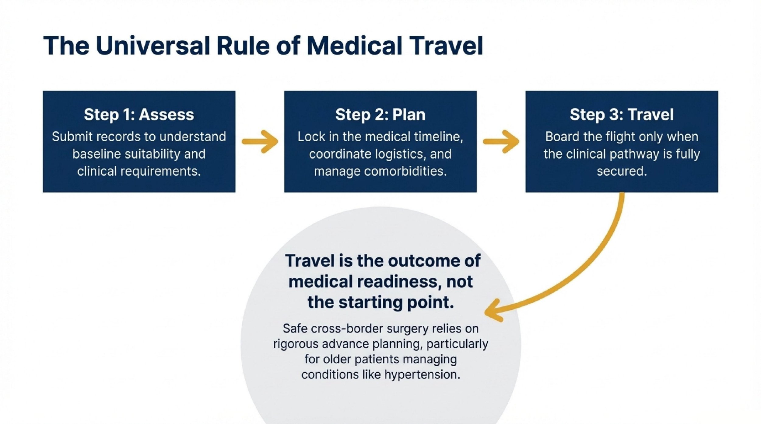 Before any trip was finalized, the medical side reviewed his hernia diagnosis and his history of hypertension remotely. In an older patient, blood pressure management and peri-operative planning are important considerations when evaluating whether surgery can proceed smoothly and safely.