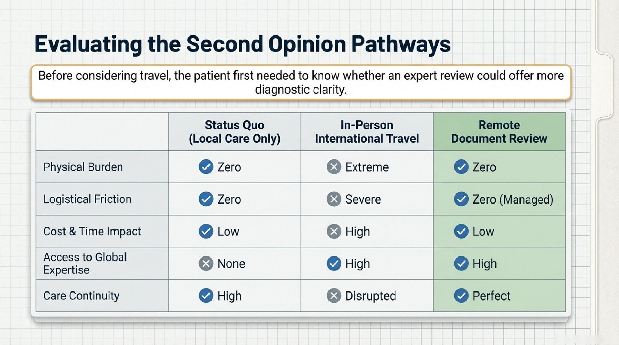 Traveling internationally for an in-person visit, however, would have meant added cost, time, and physical burden at an already stressful moment. There were also practical barriers, including medical record preparation, translation, and the challenge of communicating a complex case across healthcare systems.