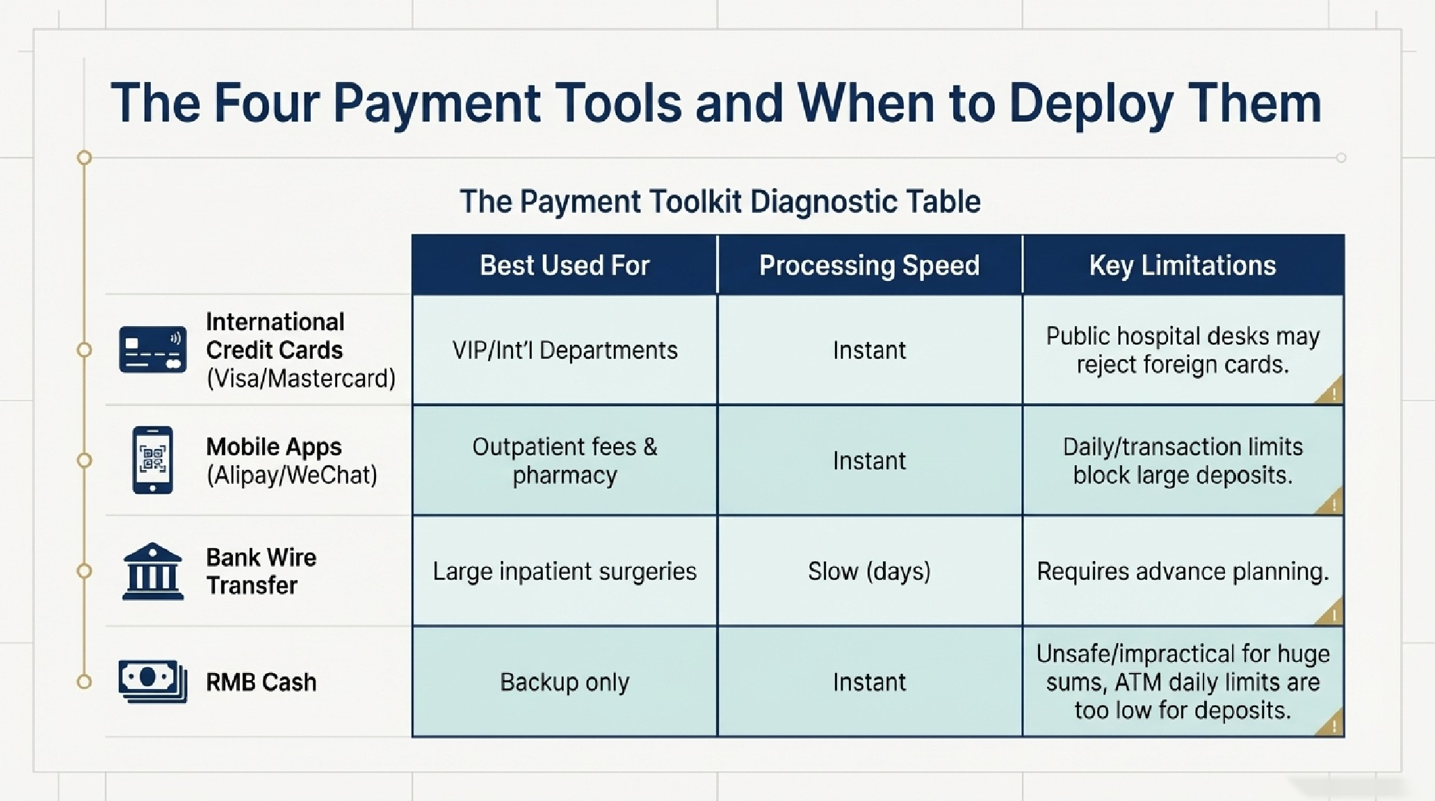 Chinese hospitals, particularly the international or VIP departments of major public hospitals and private international clinics, typically support several payment options. However, not every method works in every setting, and it is generally advisable to prepare more than one option before you travel.