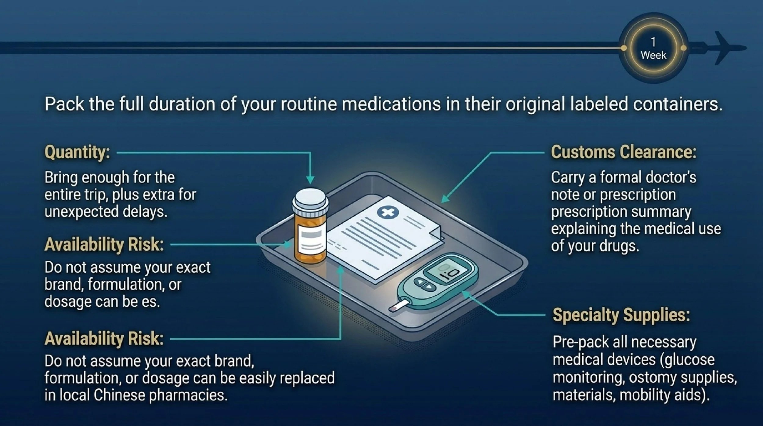 You should not assume your exact brand, formulation, or dosage will be available. Bring enough of your regular medications for the full trip, plus extra if possible, and carry documentation explaining their medical use.