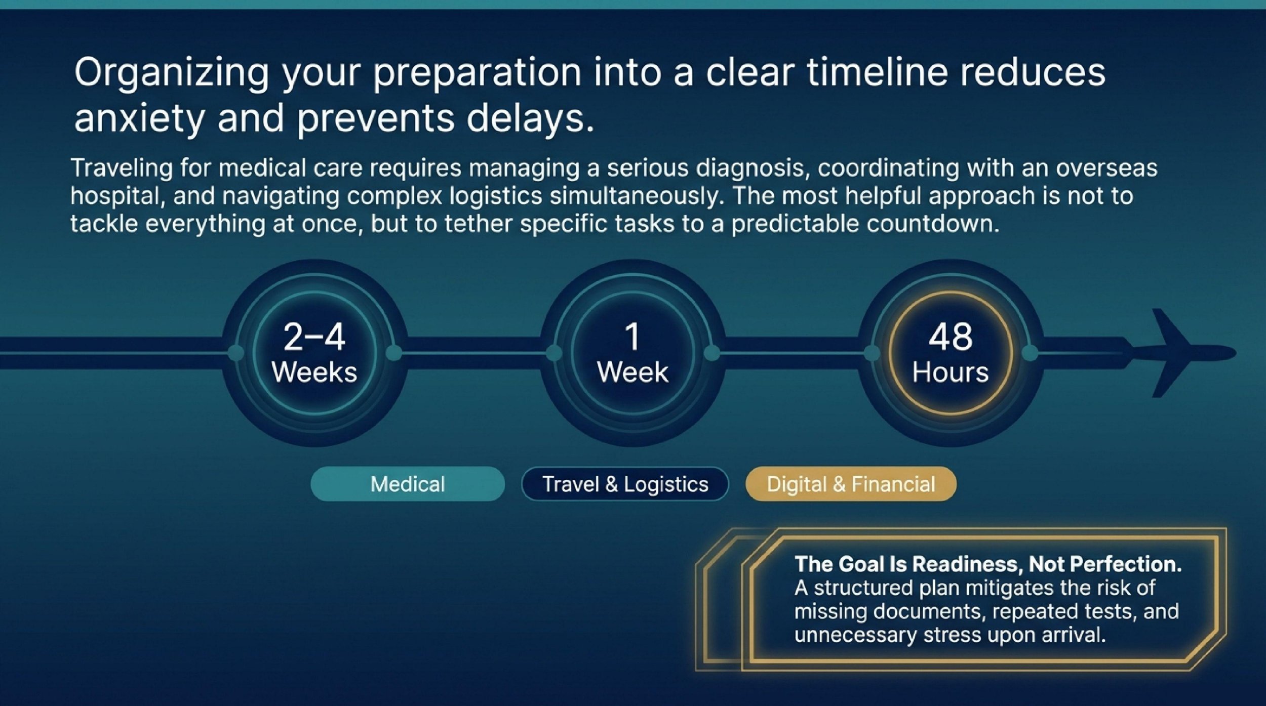 This stage is about locking in the most important parts of the trip: identity documents, hospital coordination, medical records, and financial planning.