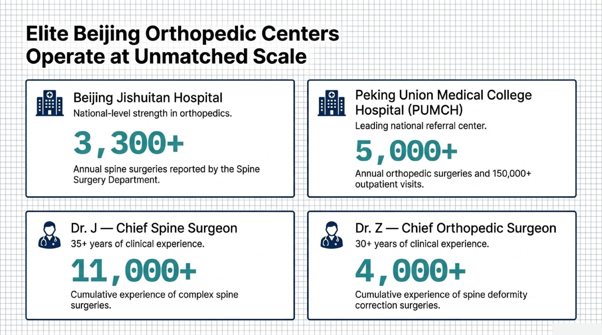 PUMCH is one of China’s leading national referral centers. Its orthopedic department reports 5,000+ annual surgeries and 150,000+ outpatient visits, with major experience in complex spine disease and advanced spine techniques. Plain-text attribution: Peking Union Medical College Hospital official description.