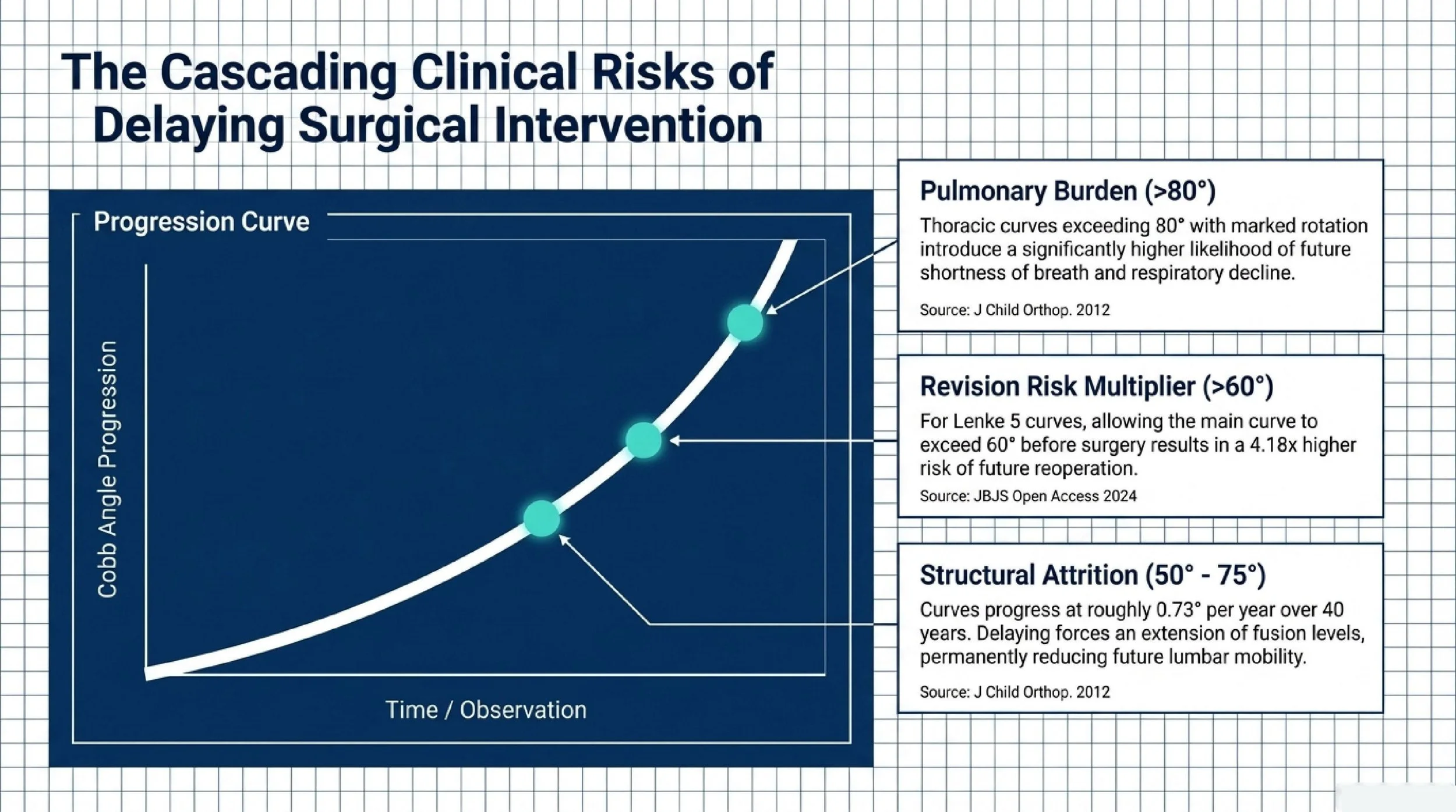 Delay may also affect revision risk. A JBJS Open Access (2024) study reported that for Lenke 5 curves, when the main curve exceeds 60°, the risk of reoperation after posterior spinal fusion rises by 4.18 times.