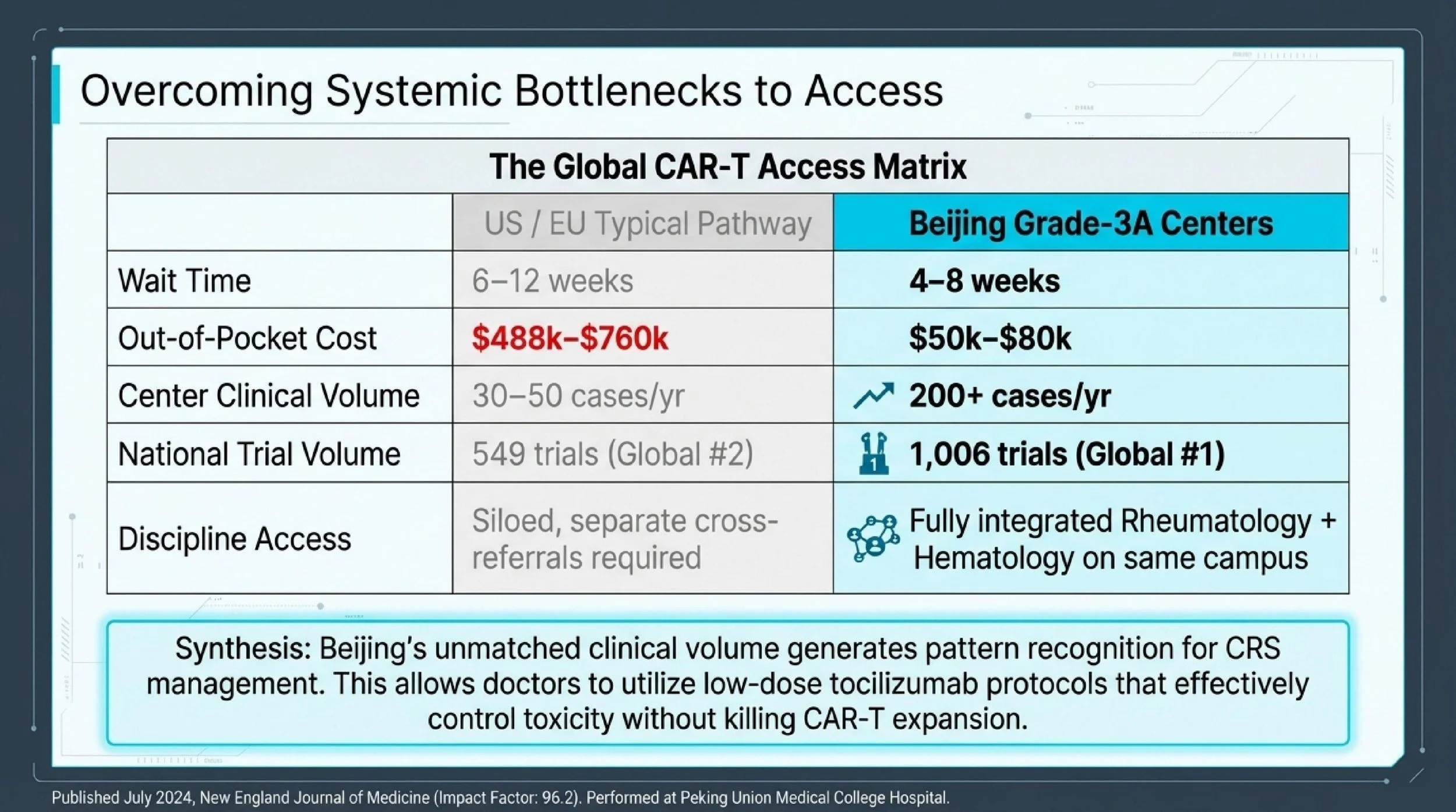 First, sheer clinical volume. China leads the world in registered CAR-T clinical trials (1,006 vs. 549 in the US, per ClinicalTrials.gov). Beijing's specialized hematology units treat CAR-T patients at a pace that builds pattern recognition for side-effect management — particularly CRS grading and low-dose tocilizumab protocols that preserve CAR-T expansion while controlling toxicity. A dedicated CAR-T unit in Beijing may manage more CRS cases in a single week than many European regional centers handle in a quarter.