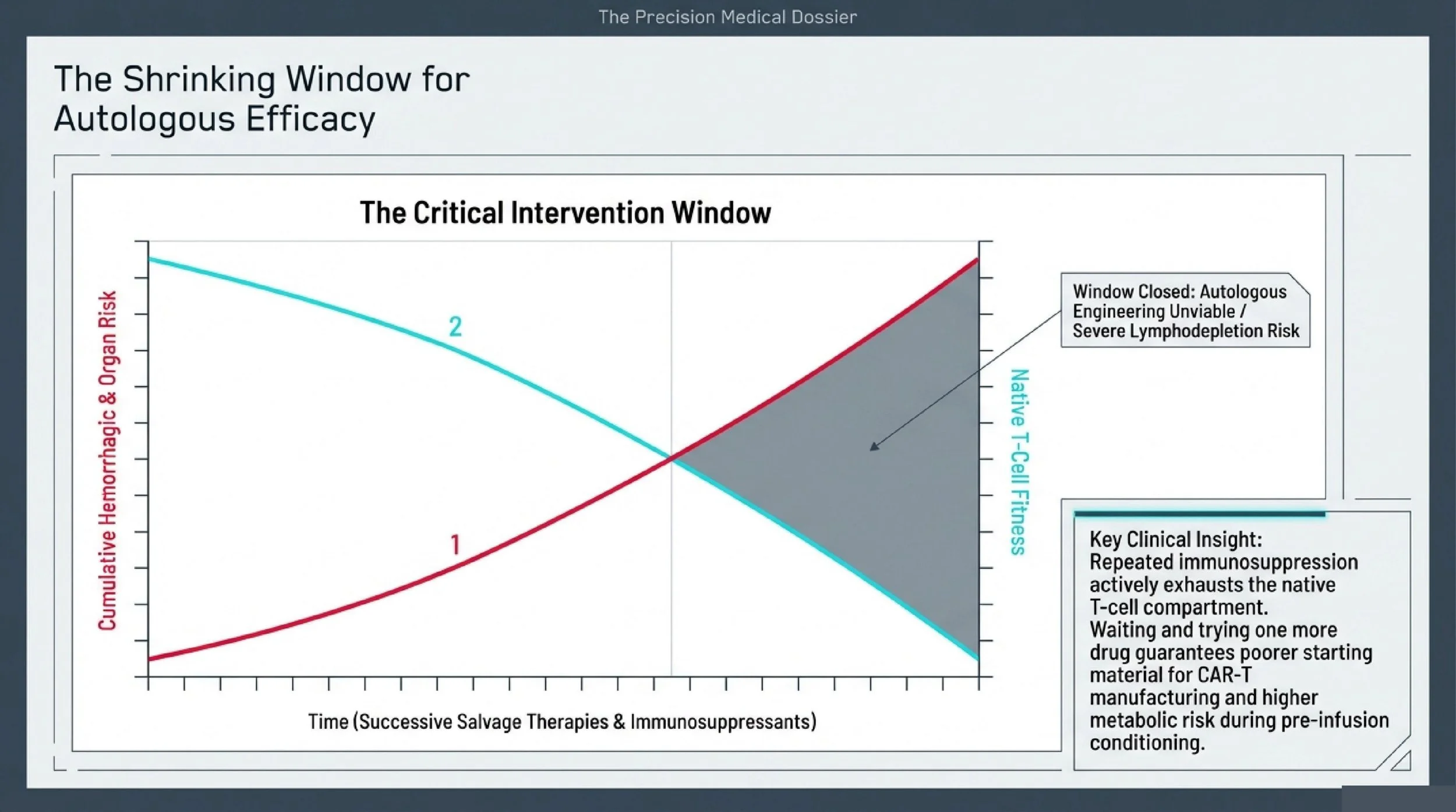 T-cell fitness degrades with each salvage attempt. CAR-T manufacturing depends on collecting T-cells that are functional enough to be engineered and expanded. Repeated rounds of immunosuppressive therapy exhaust the native T-cell compartment. The longer a patient waits, the higher the probability that their own cells will be too depleted or dysfunctional for successful autologous CAR-T production. At that point, the only remaining option may be allogeneic (donor-derived) CAR-T, which introduces additional complexity.