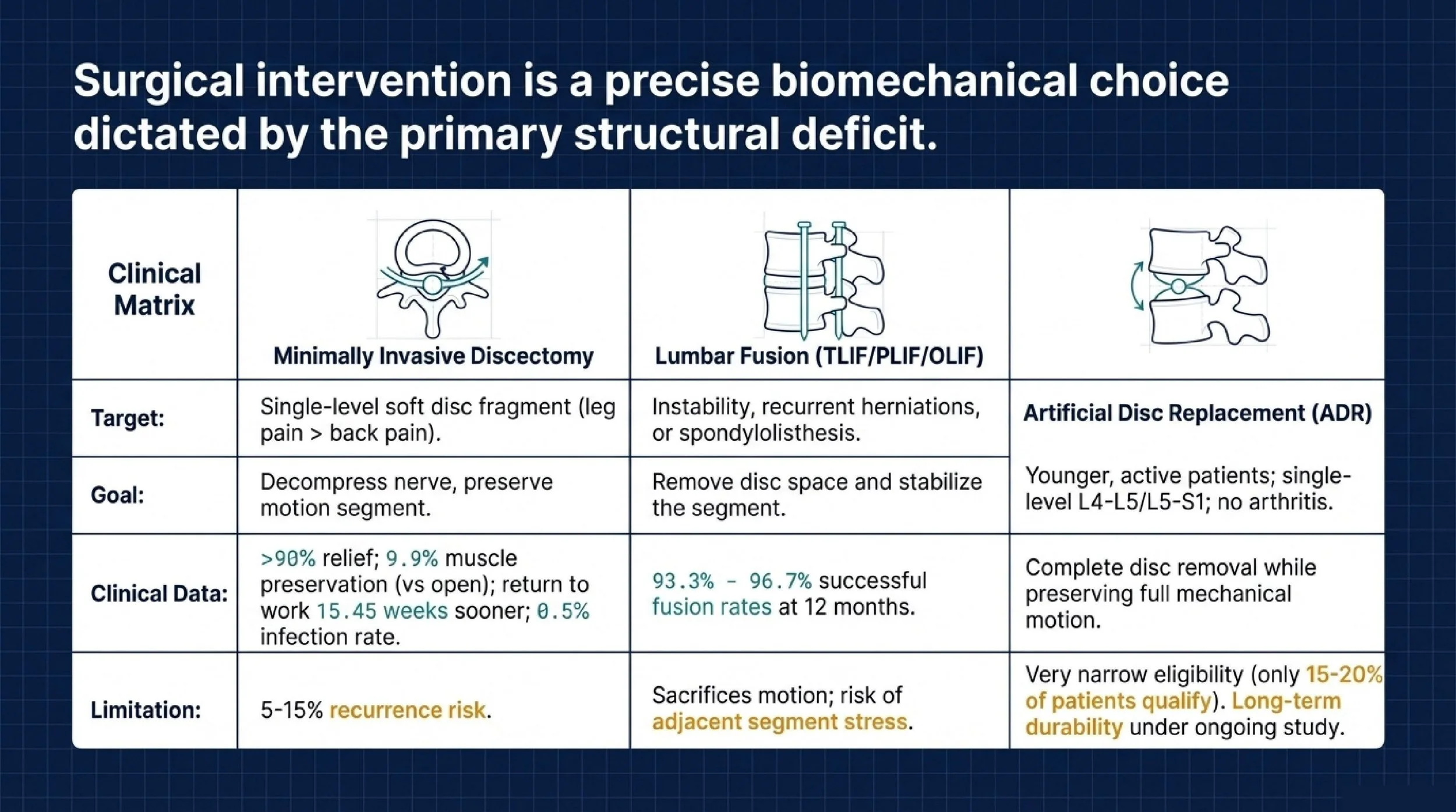 But selection is strict. The source material estimates that only 15% to 20% of lumbar disc herniation patients qualify. It is generally contraindicated in osteoporosis, facet arthropathy, prior spinal surgery, and deformity. It also comes with higher implant-related cost and ongoing questions about durability beyond 10 to 20 years.