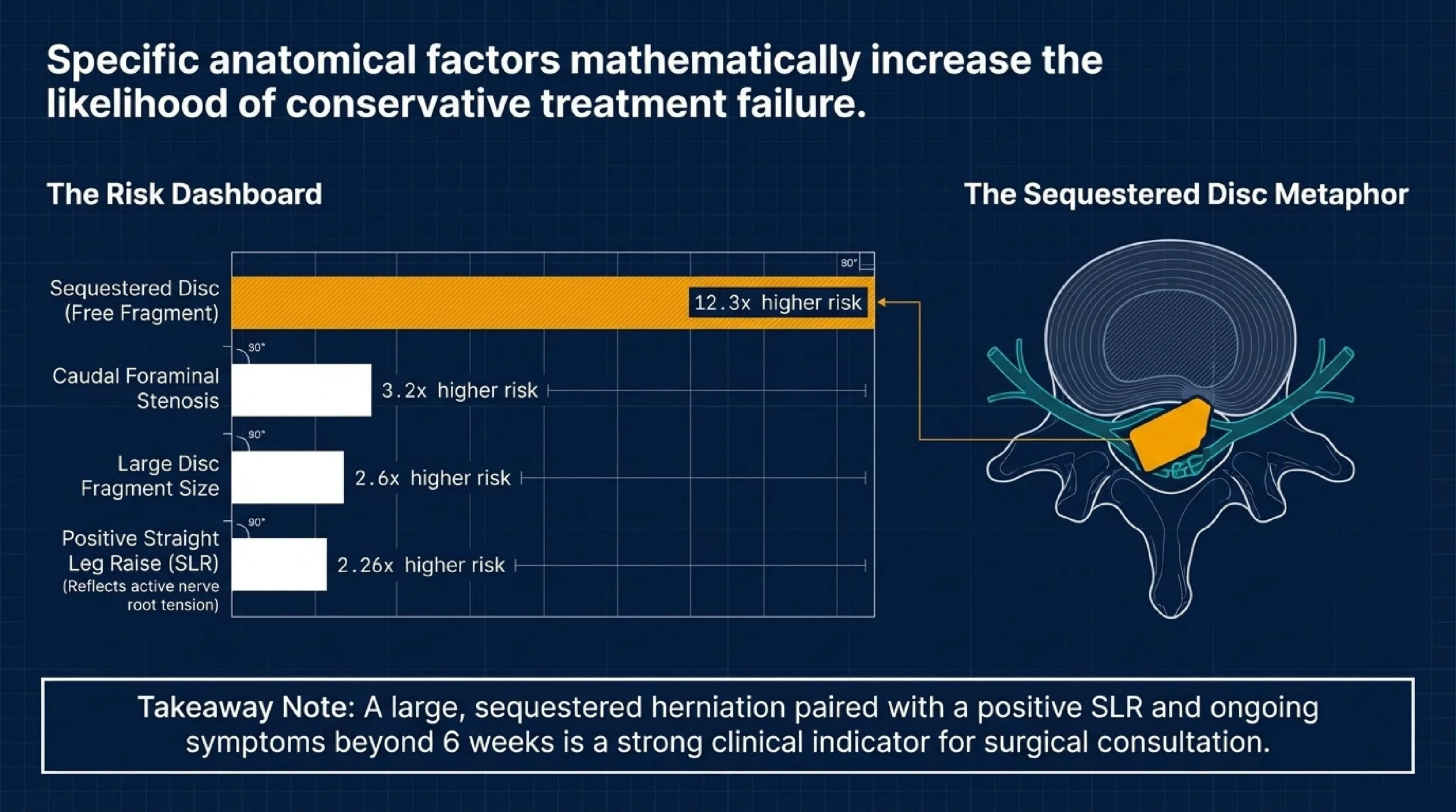 The strongest predictor listed was a sequestered disc herniation, with an odds ratio of 12.3. That matters because a free fragment is not just a bulge. It often reflects a more disruptive disc event and may correlate with persistent nerve compression. Large disc fragment size also predicted conservative failure, with an odds ratio of 2.6.