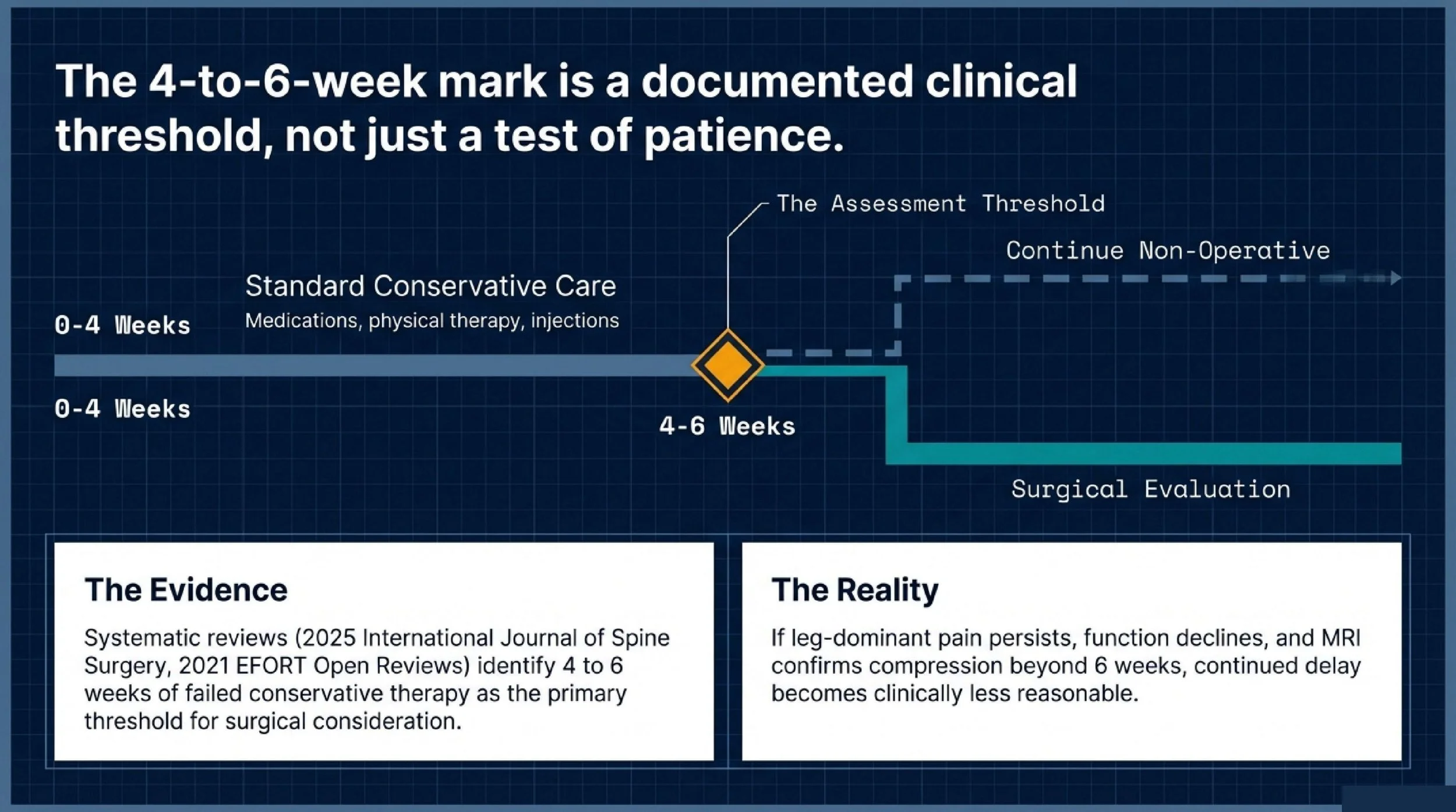 A 2025 systematic review in the International Journal of Spine Surgery, covering 20 studies on lumbar disc herniation decision-making, found that failure of conservative treatment after 4 to 6 weeks was the most commonly cited threshold for moving toward surgical consideration. A 2021 review in EFORT Open Reviews similarly concluded that surgery becomes appropriate for lumbar disc herniation when patients fail to improve after six weeks of conservative care.