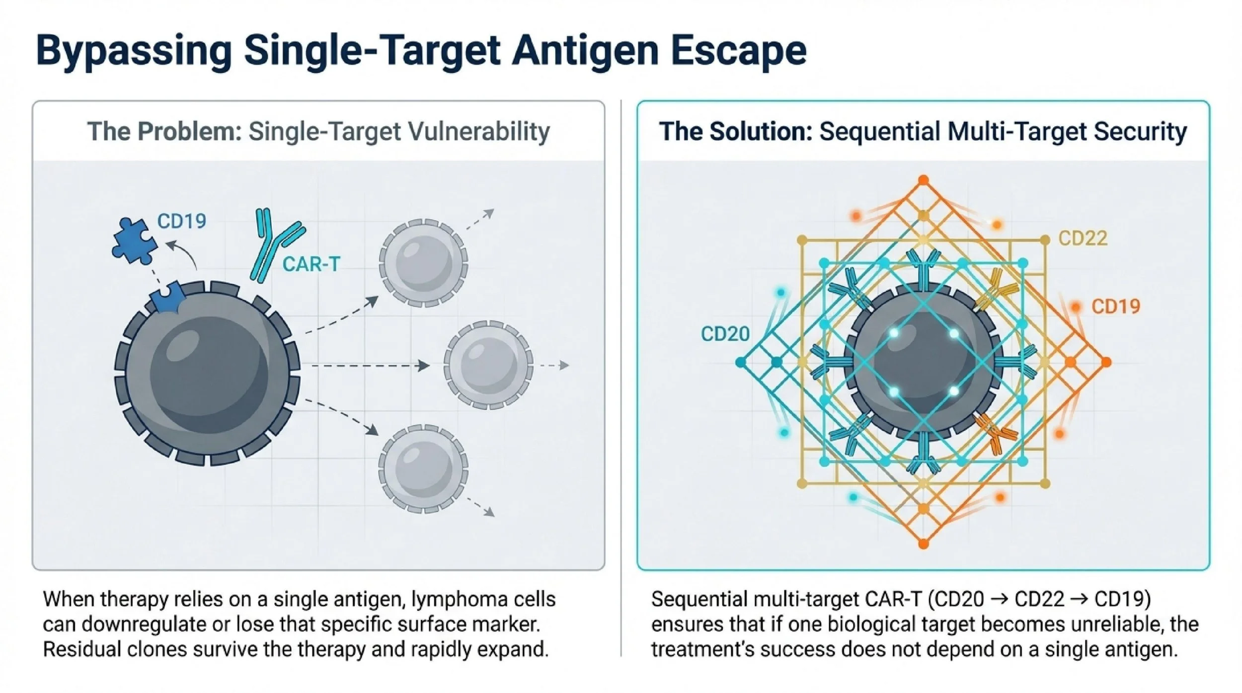 That is the rationale behind sequential multi-target CAR-T using CD20, CD22, and CD19. Instead of relying on only one antigen, the treatment sequence is designed to keep pressure on the lymphoma across multiple target expressions. For a patient who has already failed prior CAR-T or who has a biologically unstable relapse, this is not a small technical adjustment. It changes the salvage logic.