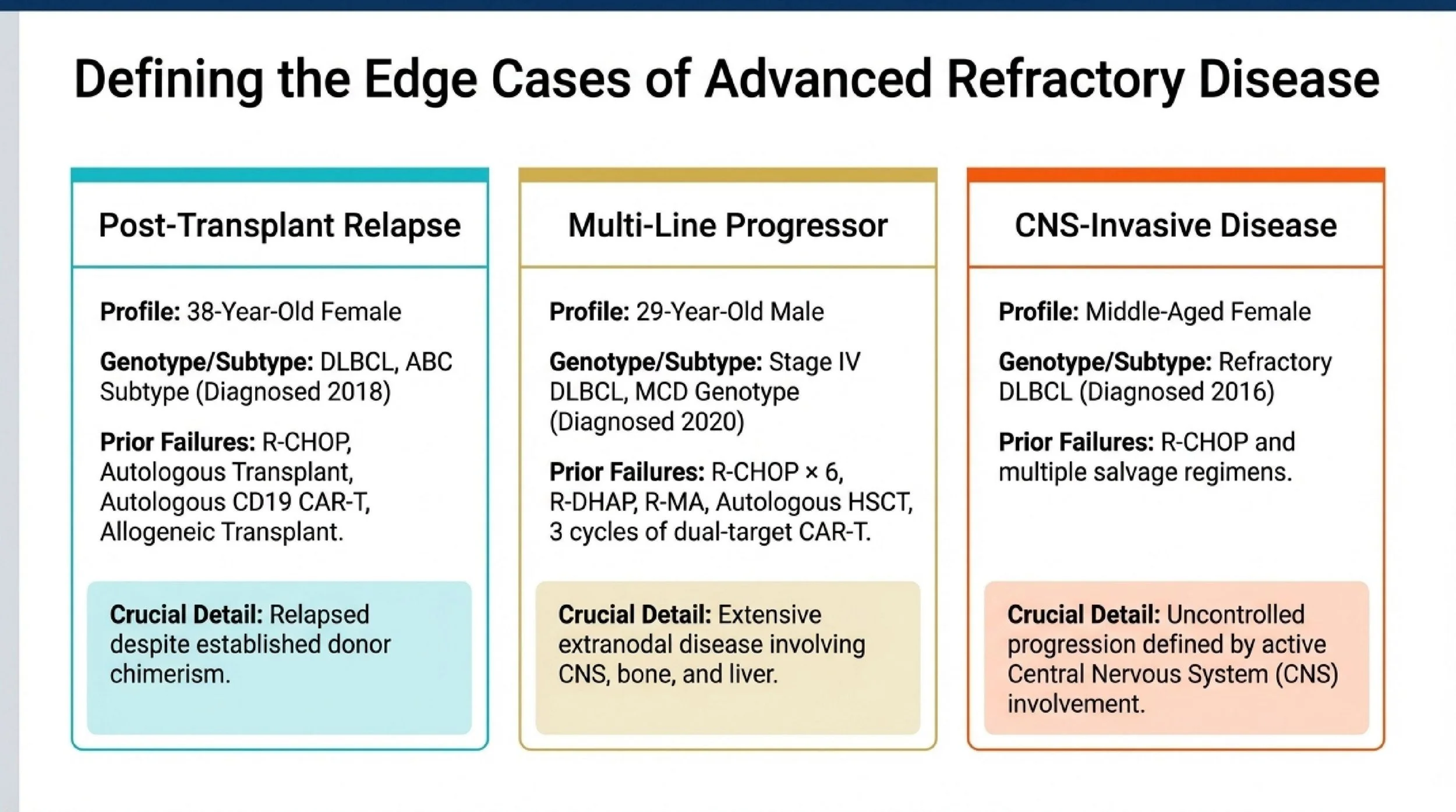 The third issue is extramedullary disease and CNS spread. In the cases summarized here, one patient had extensive extranodal disease involving the CNS, bone, and liver, and another had refractory disease with CNS involvement. Once aggressive lymphoma becomes more anatomically dispersed, salvage becomes more difficult. The longer the disease stays uncontrolled, the narrower the therapeutic window may become.