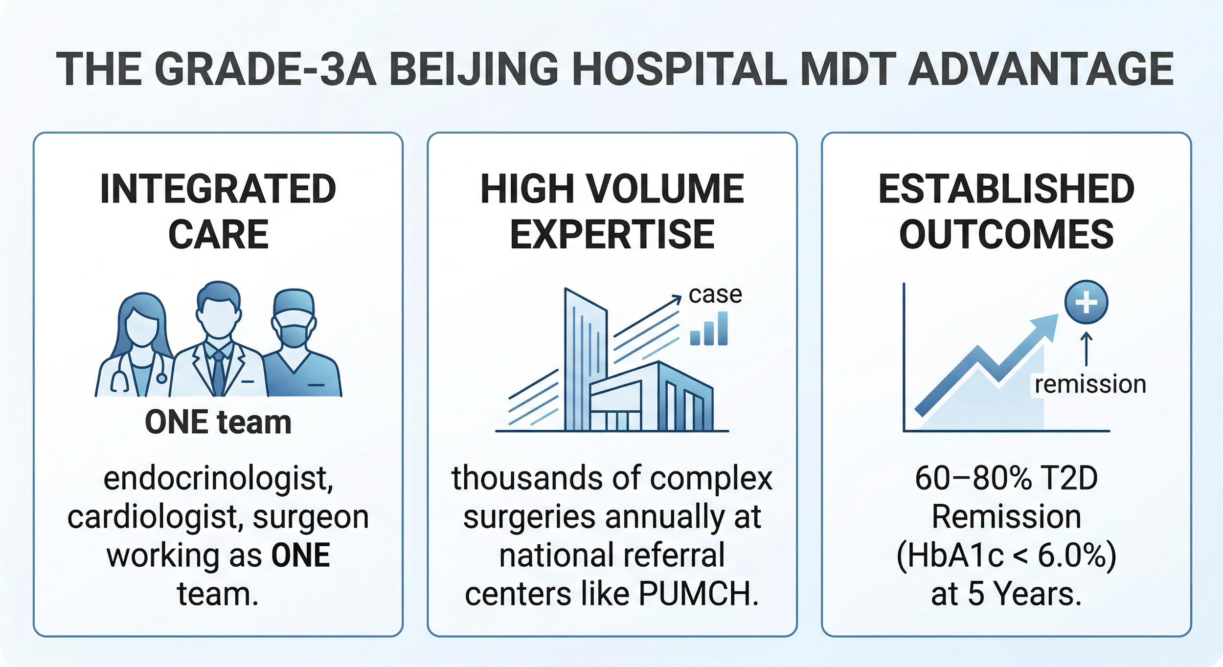 Here's the hard truth: when polypharmacy itself becomes the threat, you need a completely different path. Beijing's top Grade-3A hospitals run high-volume metabolic surgery programs with integrated Multi-Disciplinary Teams built for exactly this situation.