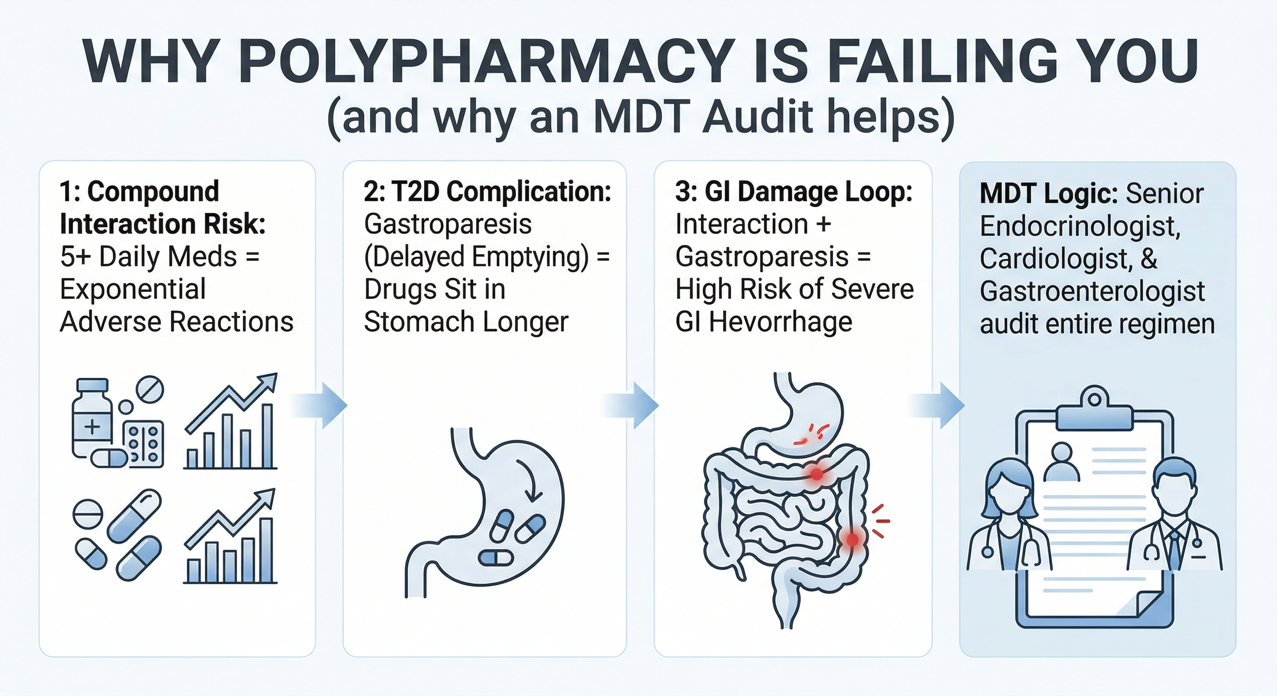 Your local endocrinologist sees the diabetes. Your cardiologist sees the heart. Your GI doctor sees the bleeding. But nobody is looking at how all three interact in your body at the same time.